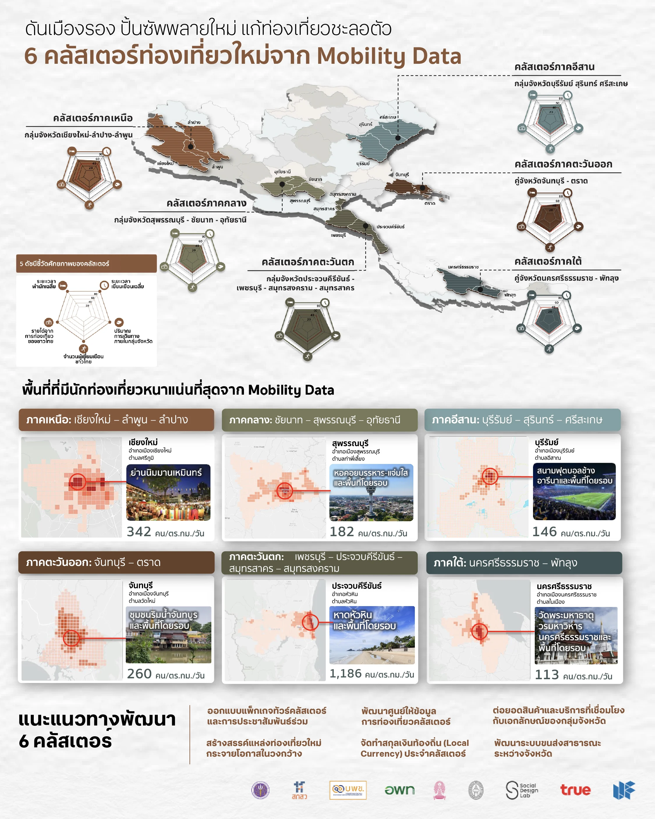 จากการวิเคราะห์เครือข่ายการเดินทางผ่าน mobility data พบว่า ประเทศไทยมีเส้นทางศักยภาพถึง 21เส้นทางที่สามารถพัฒนาสู่การท่องเที่ยวแบบคลัสเตอร์ ตัวอย่างเช่น เชียงใหม่-ลำปาง-ลำพูน, นครปฐม-ราชบุรี-กาญจนบุรี, เพชรบุรี-ประจวบคีรีขันธ์-สมุทรสาคร-สมุทรสงคราม, ขอนแก่น-ชัยภูมิ เป็นต้น ทั้งนี้ กลุ่มคลัสเตอร์จะมีศักยภาพในการพัฒนาสู่เส้นทางท่องเที่ยวได้นั้น จำต้องมีองค์ประกอบสำคัญ 5 ข้อ ได้แก่